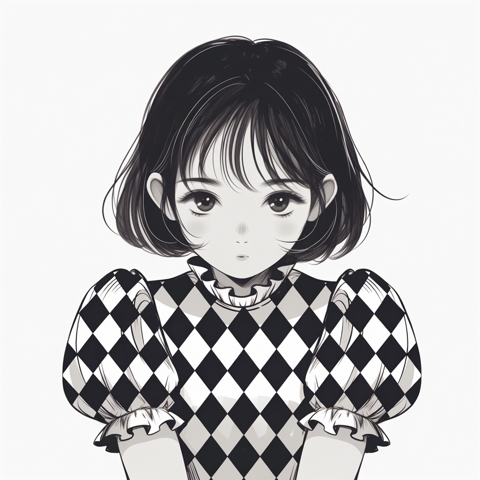 Asian, black hair, black white, bob haircut, checkered dress, cute girl, detailed drawing, doll-like, expressive face, female, frilled collar, front view, harlequin pattern, illustration, isolated background, large eyes, line art, manga style, portrait, puffed sleeves, simple background, young girl, anime girl