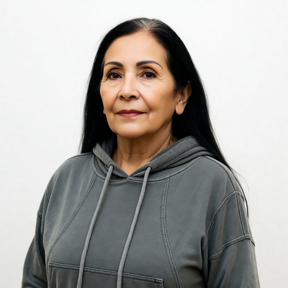 Latina, black hair, dark eyes, female, gray hoodie, headshot, hooded sweatshirt, long hair, mature woman, middle-aged, neutral expression, portrait, subtle makeup, white background, woman