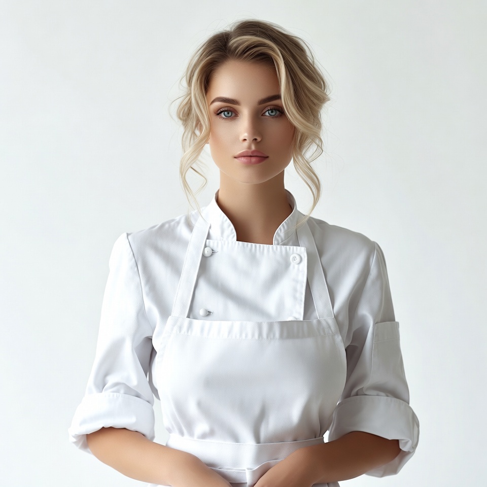 White, apron, blonde hair, chef, chef jacket, confident pose, cooking attire, female, isolated background, kitchen uniform, professional chef, studio portrait, updo hairstyle, white uniform, woman