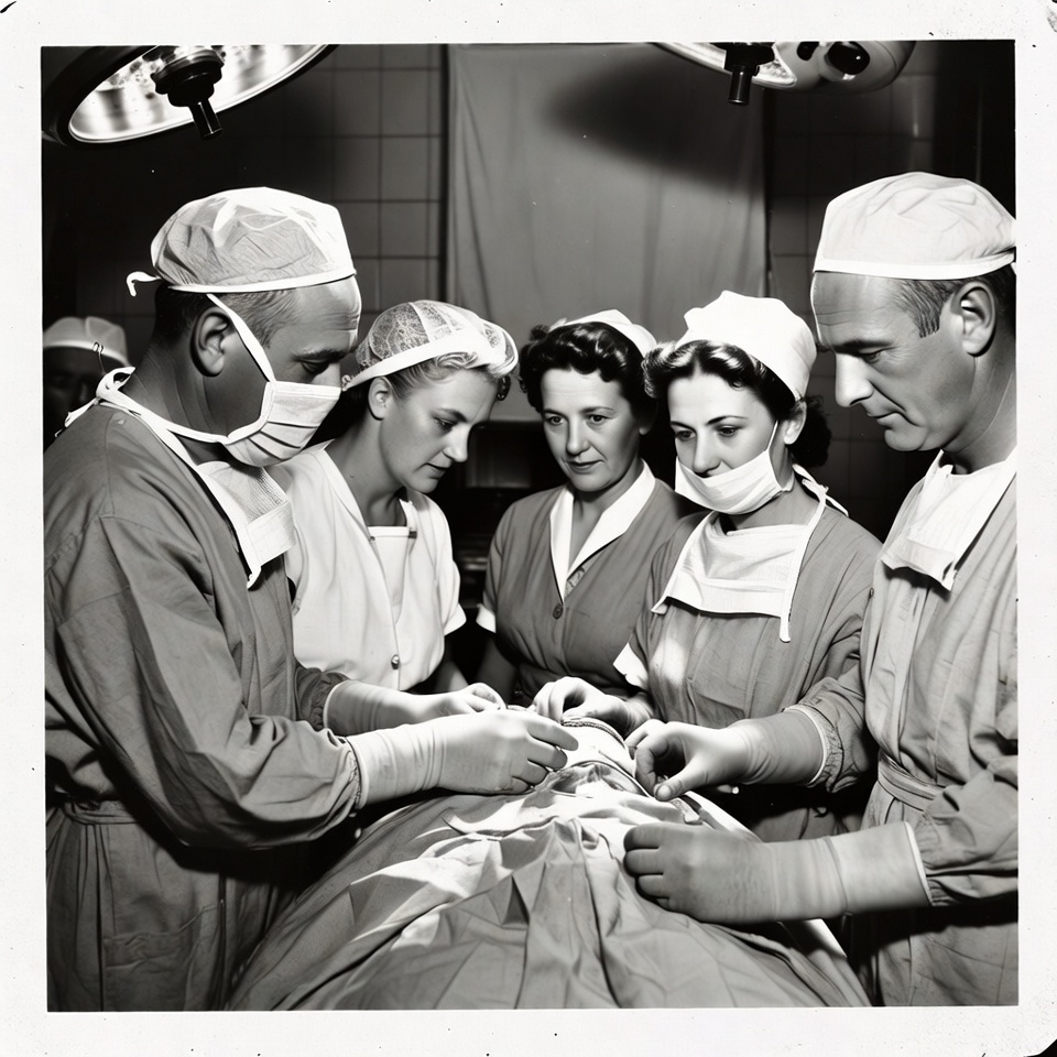 White, black and white, doctors, female nurses, healthcare, hospital, male surgeons, medical procedure, medical staff, men, nurses, operating room, operating table, operation, patient, scalpel, surgeons, surgical gloves, surgical gowns, surgical lights, surgical masks, surgical team, teamwork, vintage photo, women, surgery