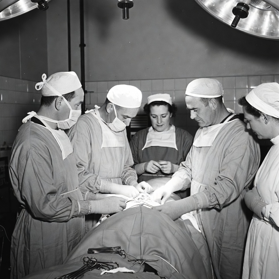 OR team, black and white, doctors, female nurses, gloved hands, healthcare, hospital, incision, male surgeons, medical procedure, medical team, nurses, operating room, operating table, operation, patient, sterile environment, surgery, surgical gowns, surgical instruments, surgical lights, surgical masks, vintage photo, surgeons