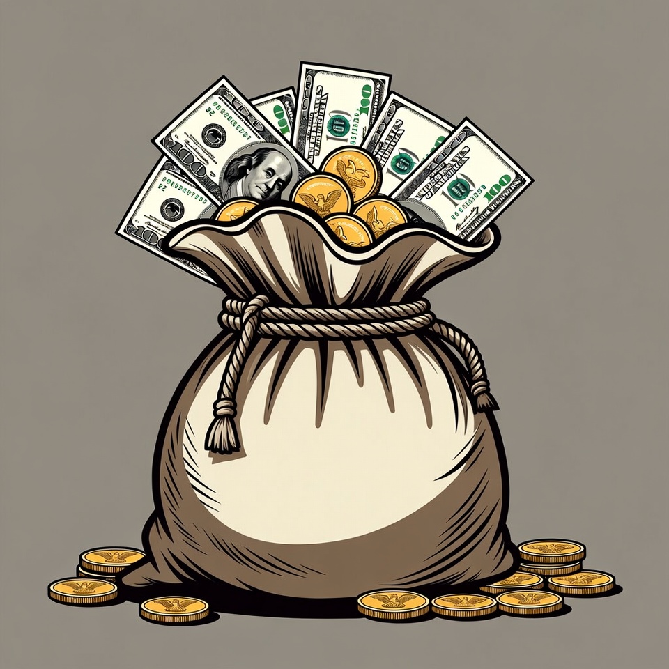 A brown drawstring bag overflows with stacks of U.S. dollar bills featuring Benjamin Franklin and gold coins. Scattered gold coins lie around the base on a gray background. The illustration is detailed in a cartoon style with bold outlines.