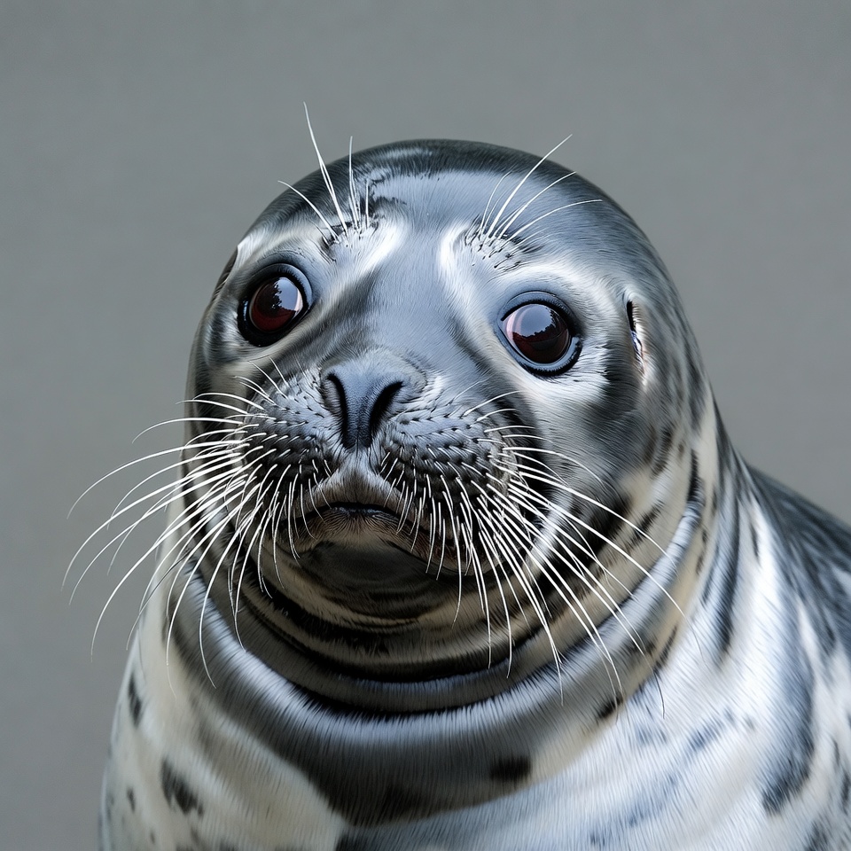 A harbor seal with glossy black and white fur stares directly at the camera with large, wide-open blue eyes. Its whiskers protrude prominently around its black nose and mouth. The seal is centered against a plain gray background.
