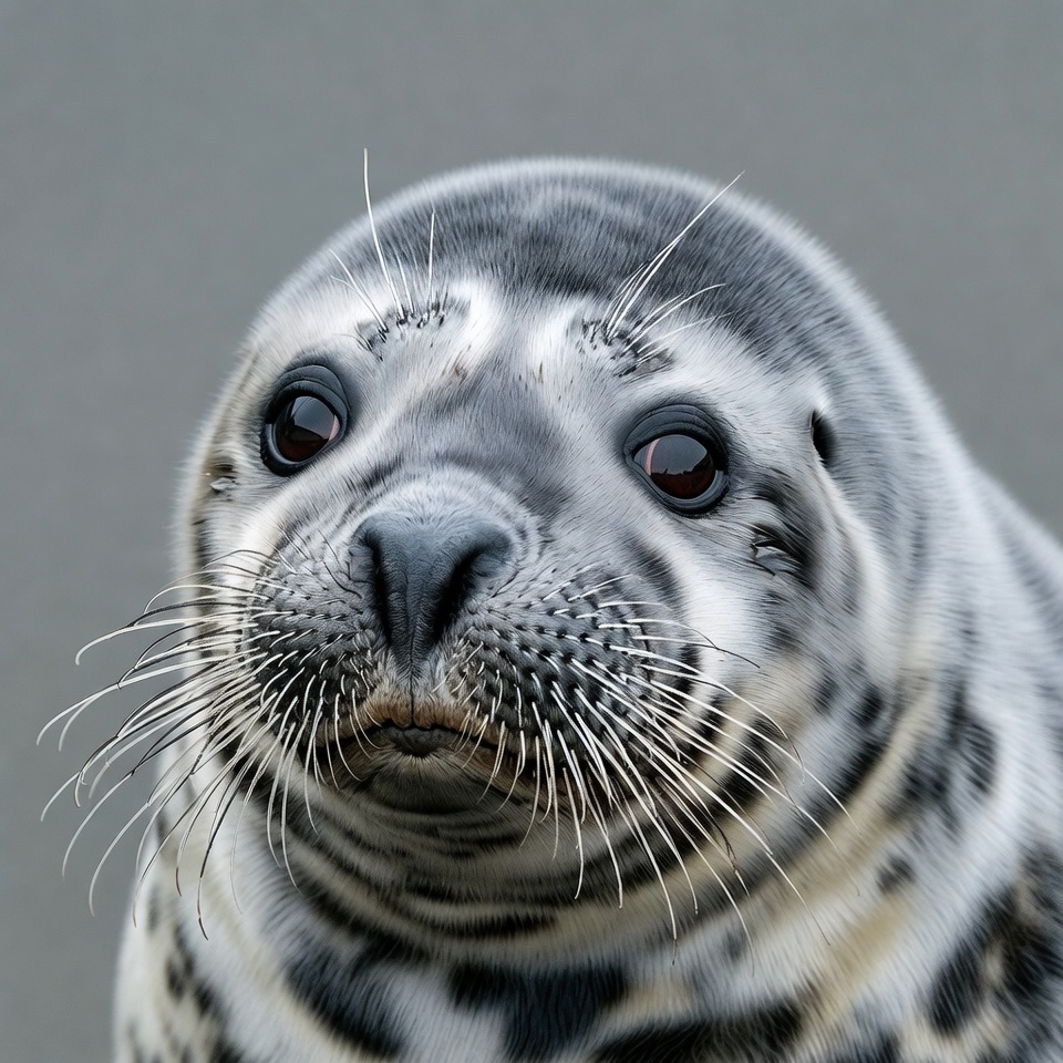 A baby harp seal with grey and white fur stares directly at the camera with large dark eyes. Its whiskers protrude prominently from its black nose on a plain grey background. The seal's fluffy face fills the frame in a detailed portrait.