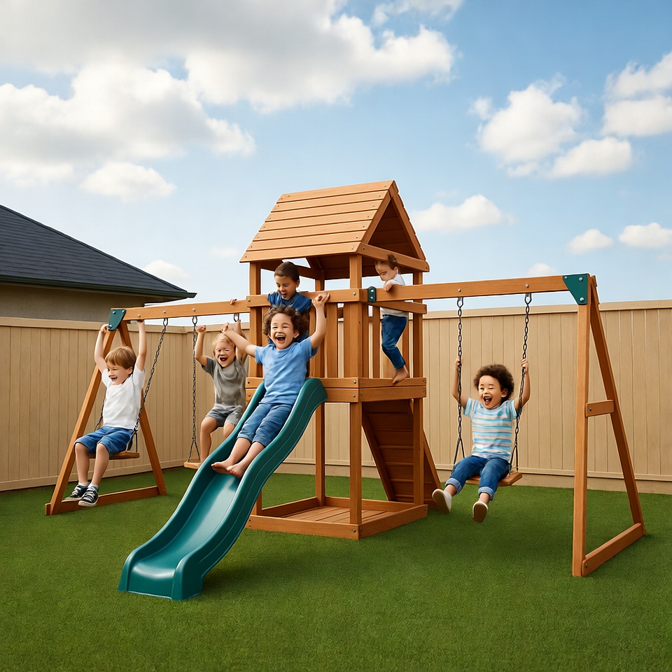 A group of young children enjoys a wooden backyard playset with swings, a slide, and climbing structure under a blue sky with clouds. The kids, dressed in casual summer clothes, swing, slide, and climb enthusiastically. The setup is positioned on green grass next to a beige fence and a house.