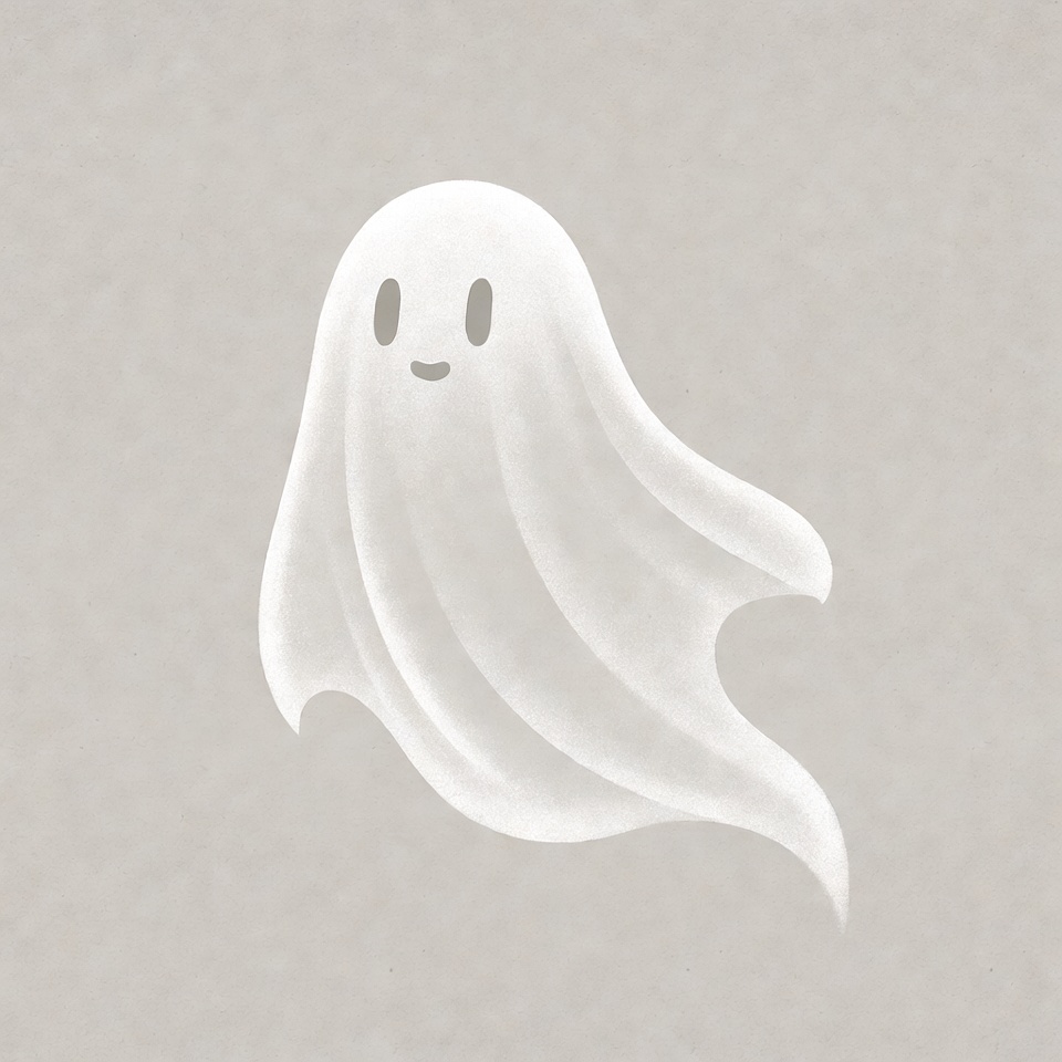 A cute white ghost with a smiling face and big eyes floats on a light gray background. The ghost has a flowing sheet-like body with tapered ends. It is a simple digital illustration.