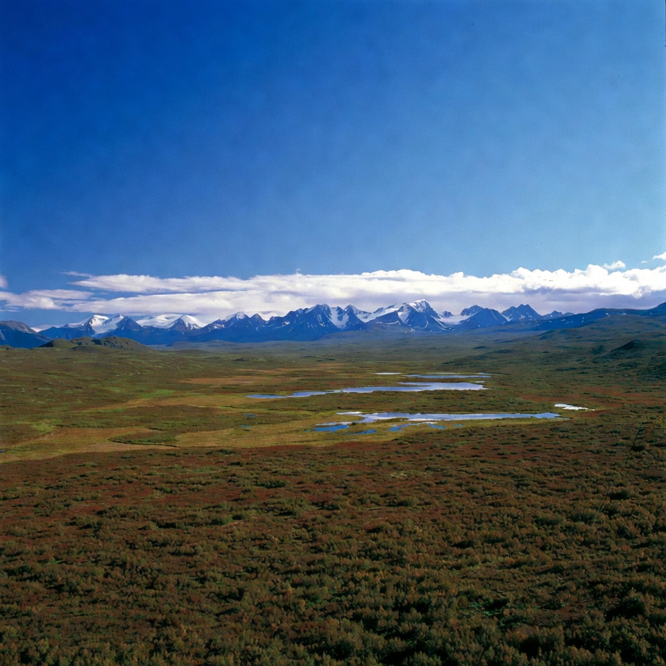 aerial view, alpine, arctic landscape, blue sky, bushes, clouds, grasslands, green fields, hills, landscape, nature, outdoors, plain, ponds, red tundra, remote, scenery, snowcaps, snowy peaks, tundra, valley, vegetation, water bodies, wilderness, mountains