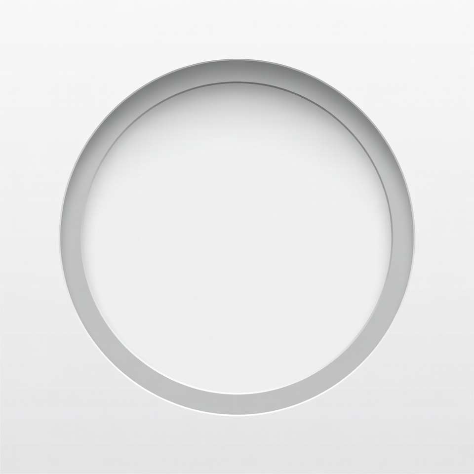 A minimalist white circle with layered paper cutout edges on a white background. The design features concentric circular borders in varying shades of gray and white. It creates a clean, isolated geometric shape suitable for overlays.