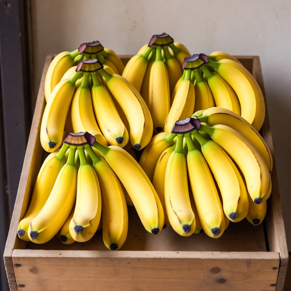 A wooden crate filled with ripe yellow bananas sits on a surface. The bananas are clustered together with green tips and some purple spots on the stems. The crate is viewed from above against a plain background.