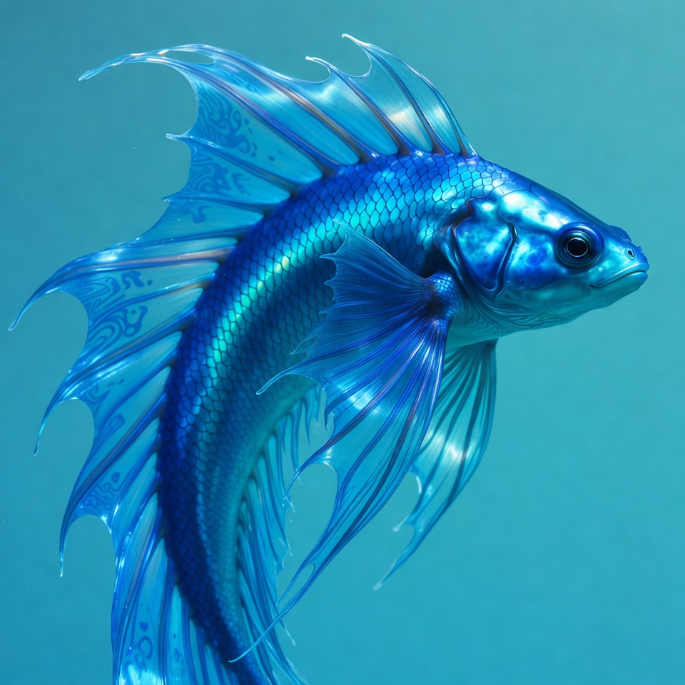 A vibrant blue betta fish swims against a matching blue background. Its elaborate fins shimmer with intricate patterns and flow elegantly. The fish faces forward with a detailed eye and glossy scales.