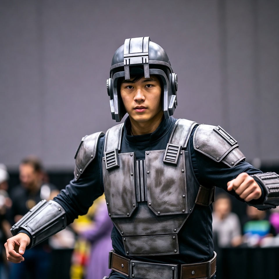 A young Asian man wears detailed gray Mandalorian armor including a helmet with T-visor, chest plate, and gauntlets. He stands in a dynamic pose with arms extended at a convention event. Blurred crowds and booths are visible in the background.
