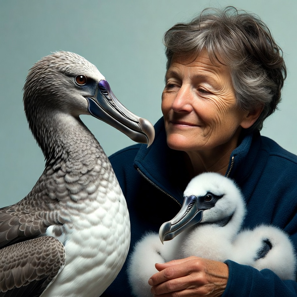 An elderly White woman with short gray hair smiles while holding a fluffy white albatross chick in her arms. A large gray albatross with a distinctive curved beak stands beside her, looking towards her face. She wears a blue zip-up jacket against a light blue background.