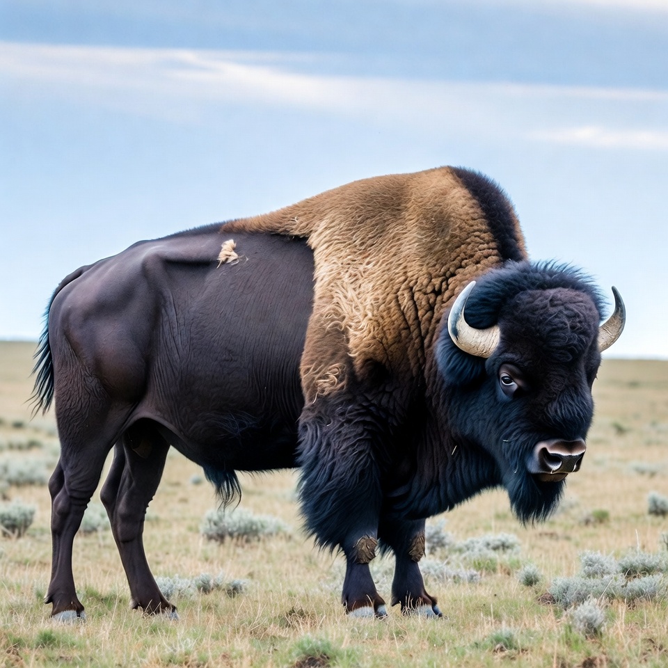 American bison, animal, blue sky, buffalo, cloudy sky, field, grass, grassland, horns, hump, mammal, nature, outdoors, prairie, rugged landscape, shaggy fur, standing, wild animal, wildlife, bison