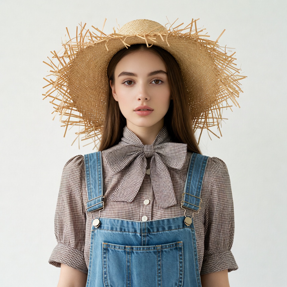A young woman with long straight hair and subtle makeup stands facing the camera against a white background. She wears a large wide-brimmed straw hat with frayed edges, a checkered blouse with a large bow collar, and denim overalls. Her expression is neutral and direct.