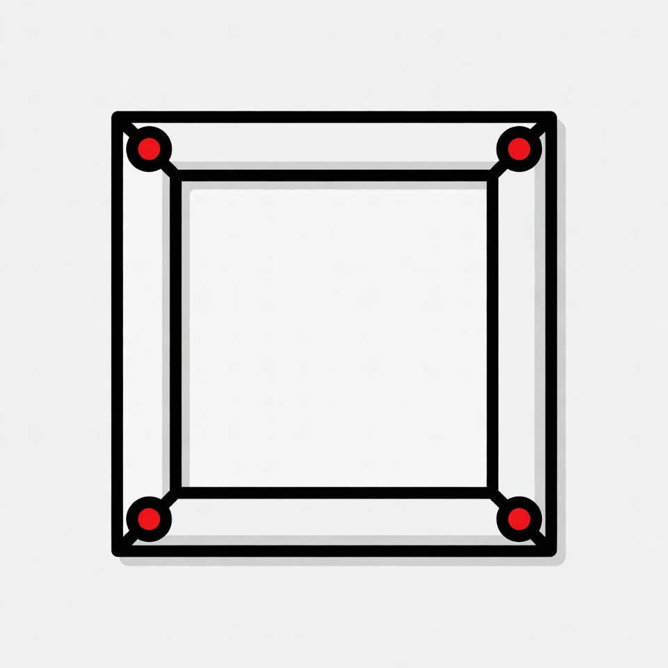A simple line art illustration of a white square frame with bold black outlines. Four red dots are positioned at the corners of the inner square. The design is flat and isolated on a light gray background.