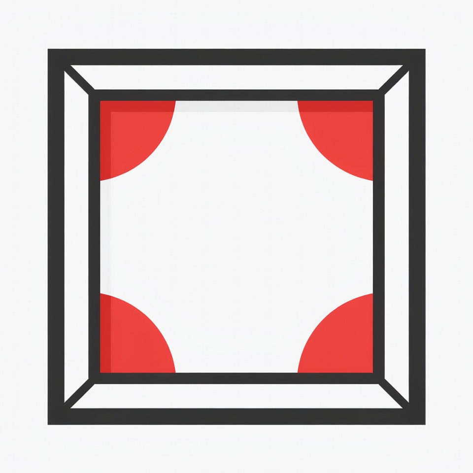 A simple flat illustration of a square picture frame with thick black outlines. Four red quarter-circles are positioned at each corner inside the white frame. The design features clean lines on an isolated transparent background.