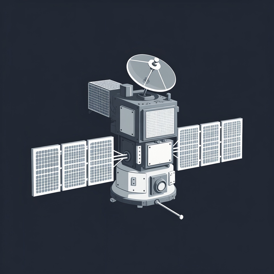 A detailed 3D illustration of a satellite against a dark space background. It features extended solar panels on both sides, a large dish antenna on top, and various mechanical panels and antennas. The design is rendered in grayscale tones.