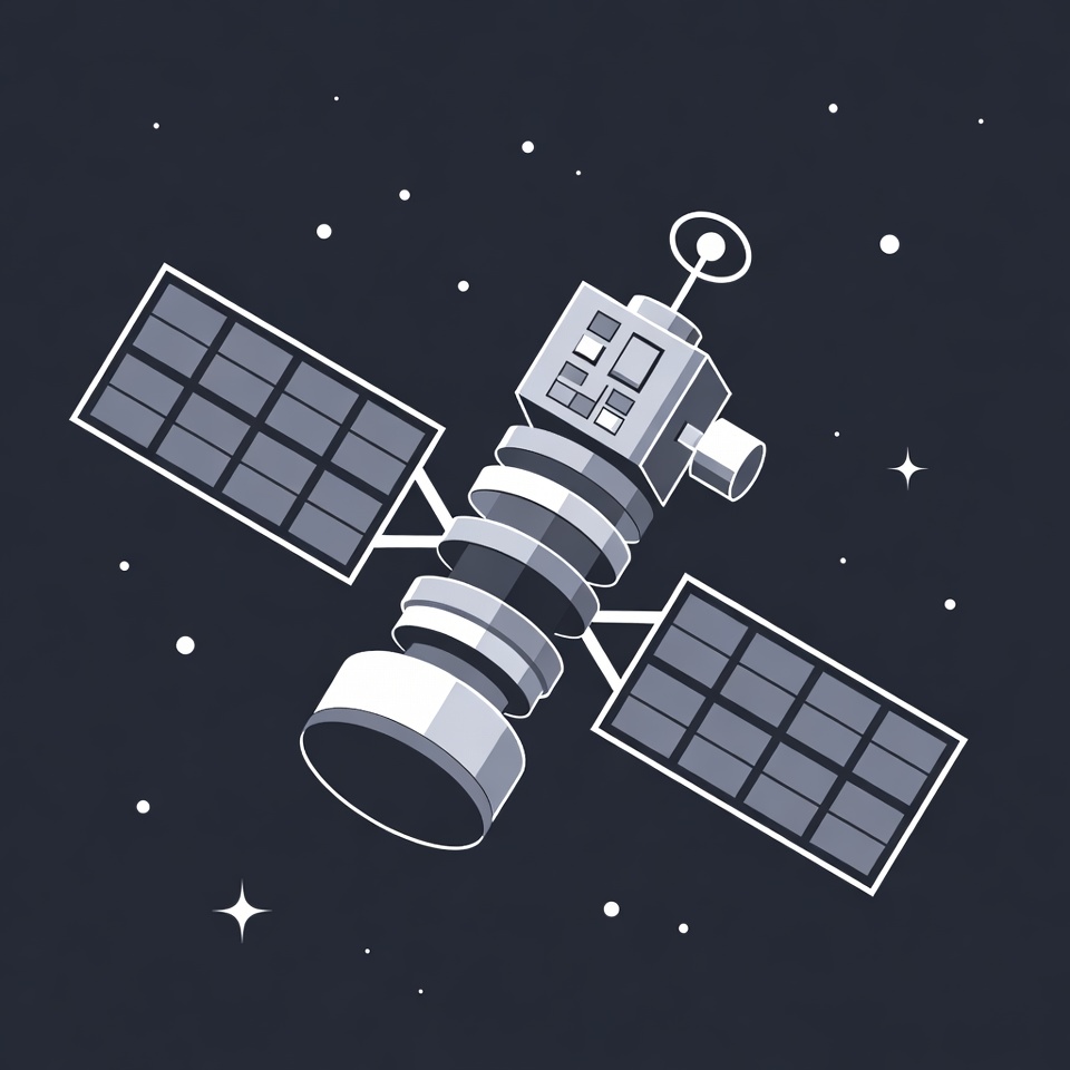 A detailed illustration of a satellite floating in outer space against a dark starry background. The satellite features large rectangular solar panels extending from its central body and various antennas. It has a sleek, metallic design with smooth gradients and subtle shadows.