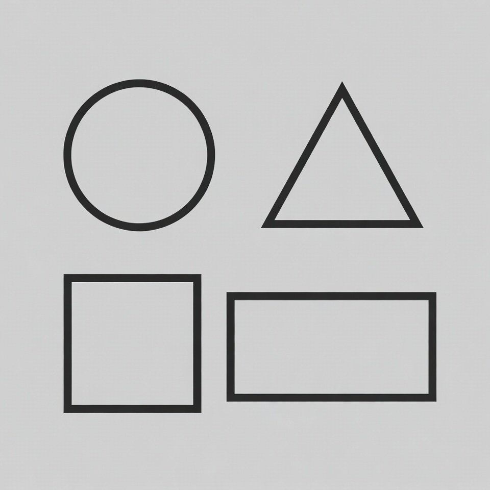 Four simple black outline shapes are arranged on a light gray background. A circle sits in the top left, a triangle in the top right, a square in the bottom left, and a larger square in the bottom right. The shapes are basic geometric forms with clean lines.