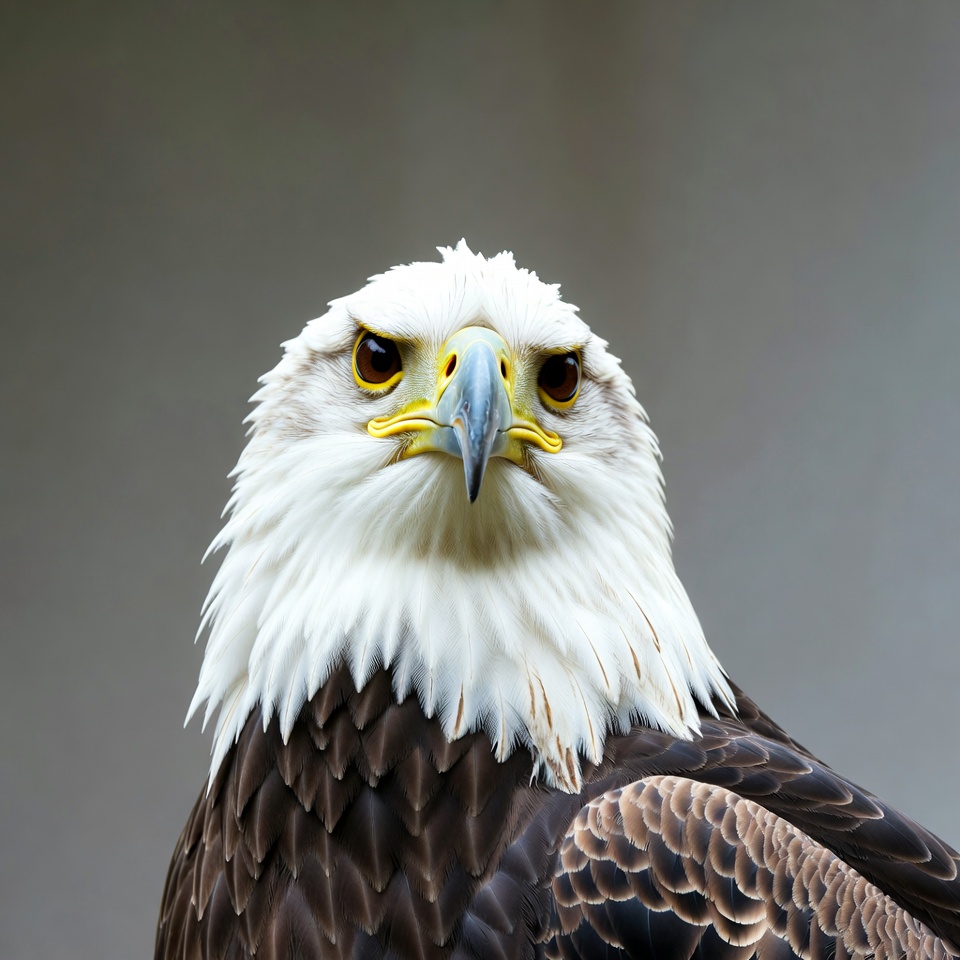 A bald eagle faces forward with a fierce expression against a plain gray background. Its white head feathers contrast sharply with the dark brown body and wings. Bright yellow beak and intense yellow eyes are prominently featured.