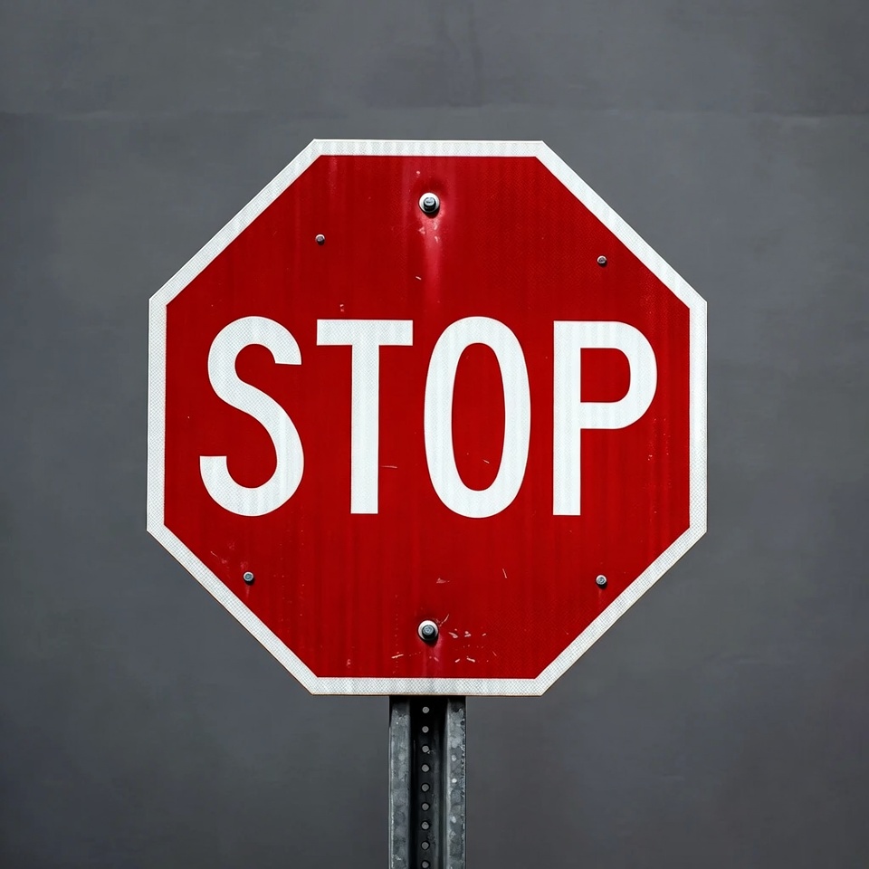 gray background, isolated, metal pole, octagonal sign, red sign, road sign, signage, stop, street sign, traffic sign, warning sign, white text, stop sign