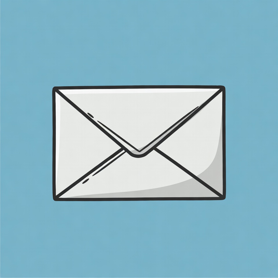 A simple hand-drawn white envelope with a flap is centered on a solid blue background. The envelope features clean black outline strokes and subtle shading for a cartoonish effect. It is depicted in a flat, isolated style typical of clipart.