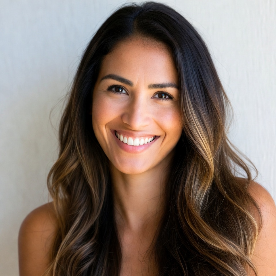 A young woman with long wavy dark brown hair highlighted with lighter tones smiles warmly at the camera. She has brown eyes and smooth skin, posing against a plain white background. Her headshot portrait highlights her joyful expression and beautiful features.
