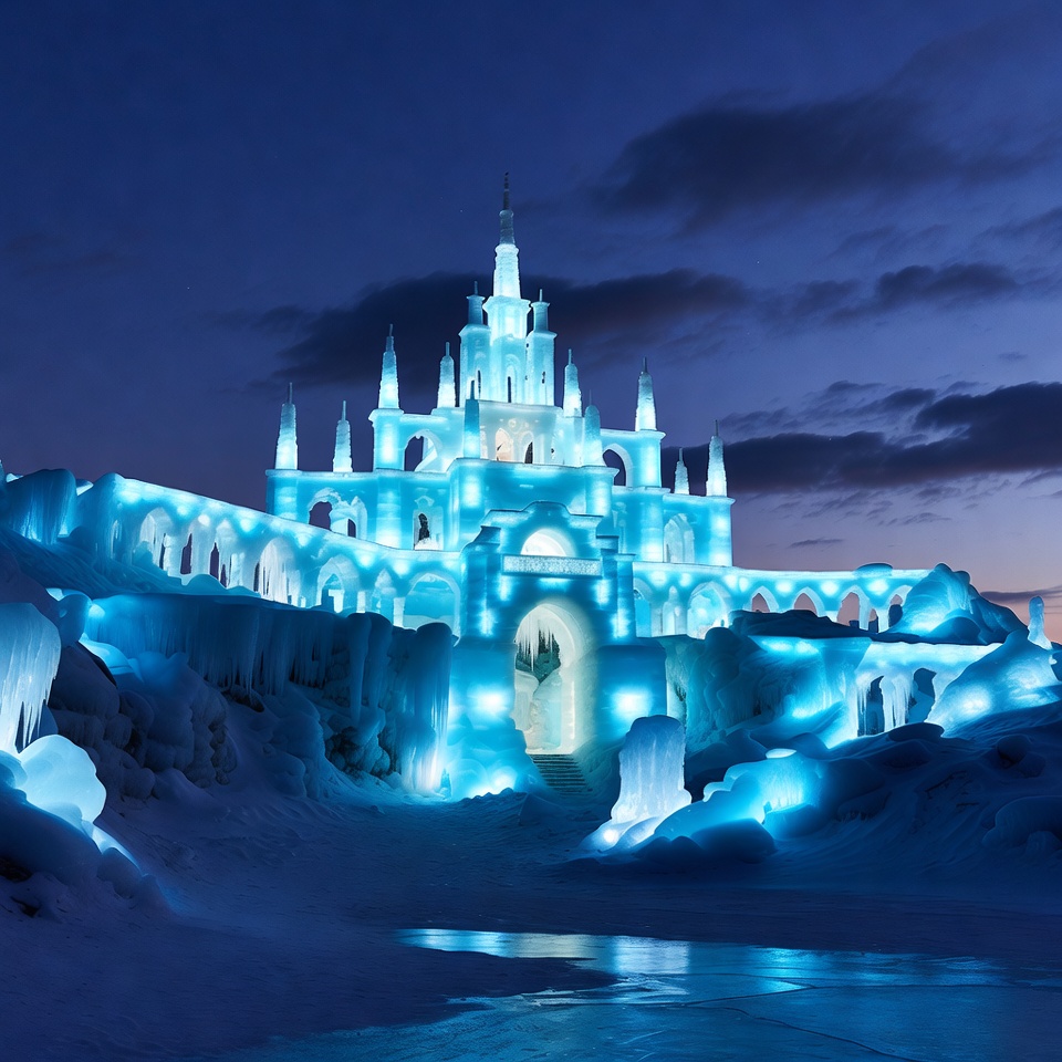 A stunning ice sculpture of a grand castle glows in bright blue light against a dark night sky. The multi-turreted structure features arched entrances, icicles, and intricate details, surrounded by snow-covered ground. Clouds and twilight hues frame the illuminated frozen architecture.