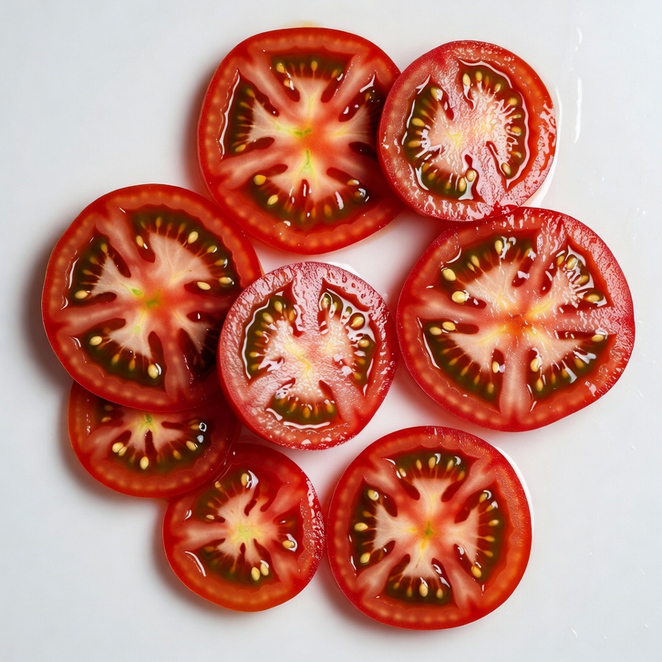 Multiple fresh tomato slices are arranged in a circular pattern on a plain white surface. Each slice reveals vibrant red flesh, gel-like interiors, and visible seeds. The tomatoes glisten slightly with moisture.