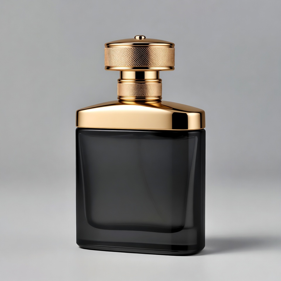 black bottle, cologne, designer bottle, fragrance, gold accents, gold cap, isolated background, luxury perfume, men's perfume, product photography, rectangular bottle, smoked glass, perfume bottle