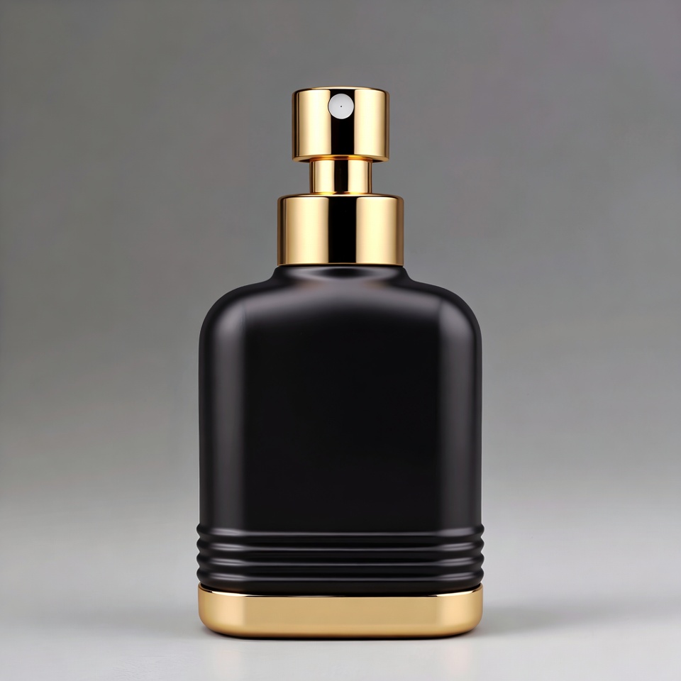 atomizer, black bottle, cologne, designer fragrance, elegant bottle, fragrance, gold accents, gold cap, isolated background, luxury perfume, matte black, men's cologne, product photo, rectangular bottle, spray bottle, perfume bottle