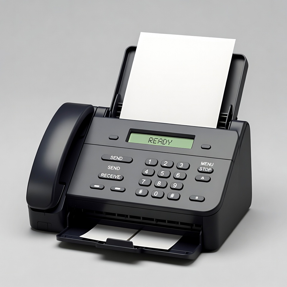 LCD screen, black fax, blank paper, handset, isolated background, numeric keypad, office equipment, paper tray, ready display, receive button, send button, fax machine