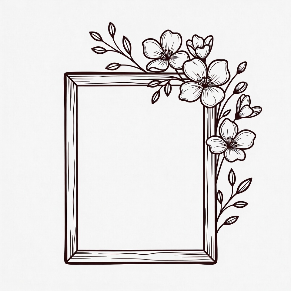 A hand-drawn wooden picture frame with an empty interior is decorated with a cluster of delicate white flowers and green leaves on the upper right side. The frame features a simple rectangular shape with visible wood grain texture in black line art style. The floral elements include blooming flowers, buds, and branching stems arranged in an elegant wreath-like design.