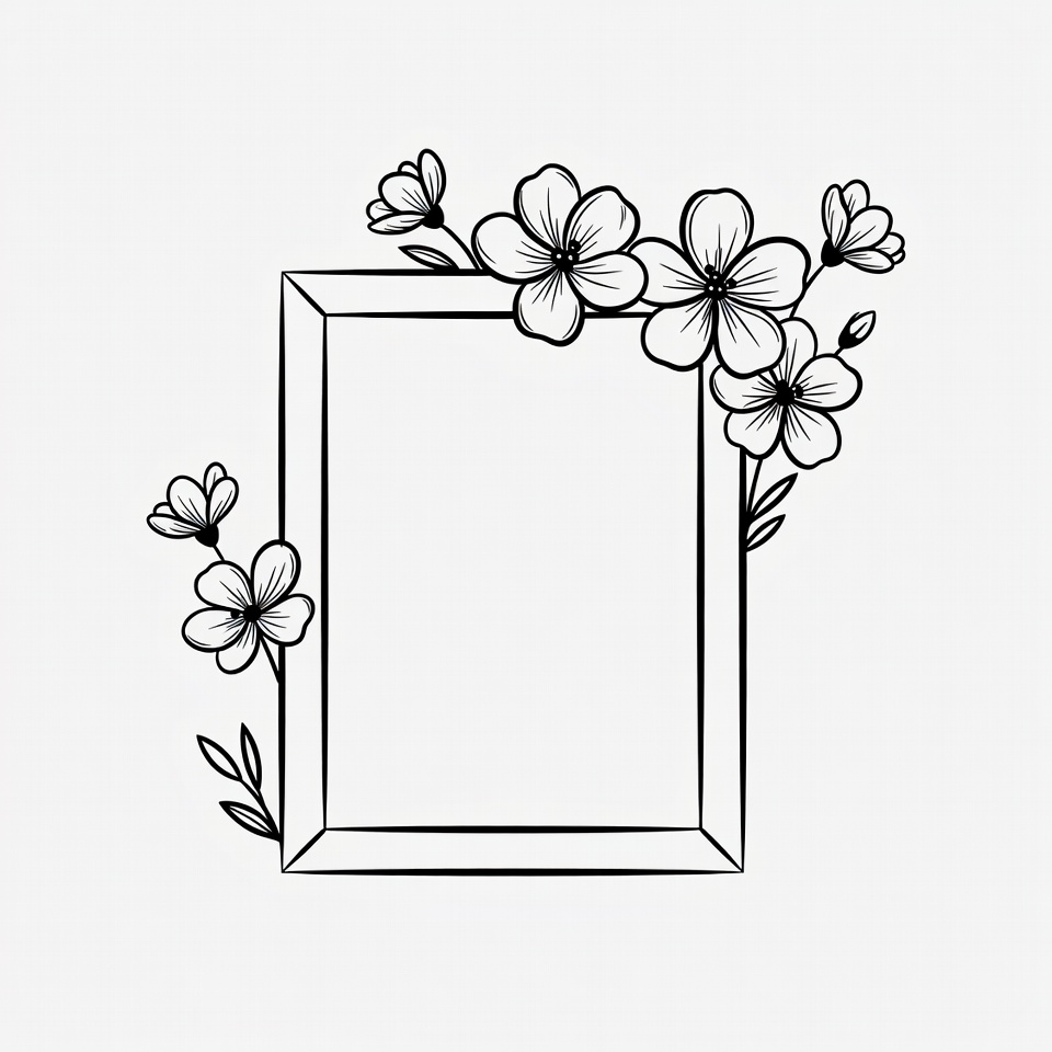 A simple line art illustration of an empty rectangular picture frame decorated with small white flowers and leaves. The flowers cluster around the top and sides of the black-framed empty space. The design features delicate outlines on a plain white background.