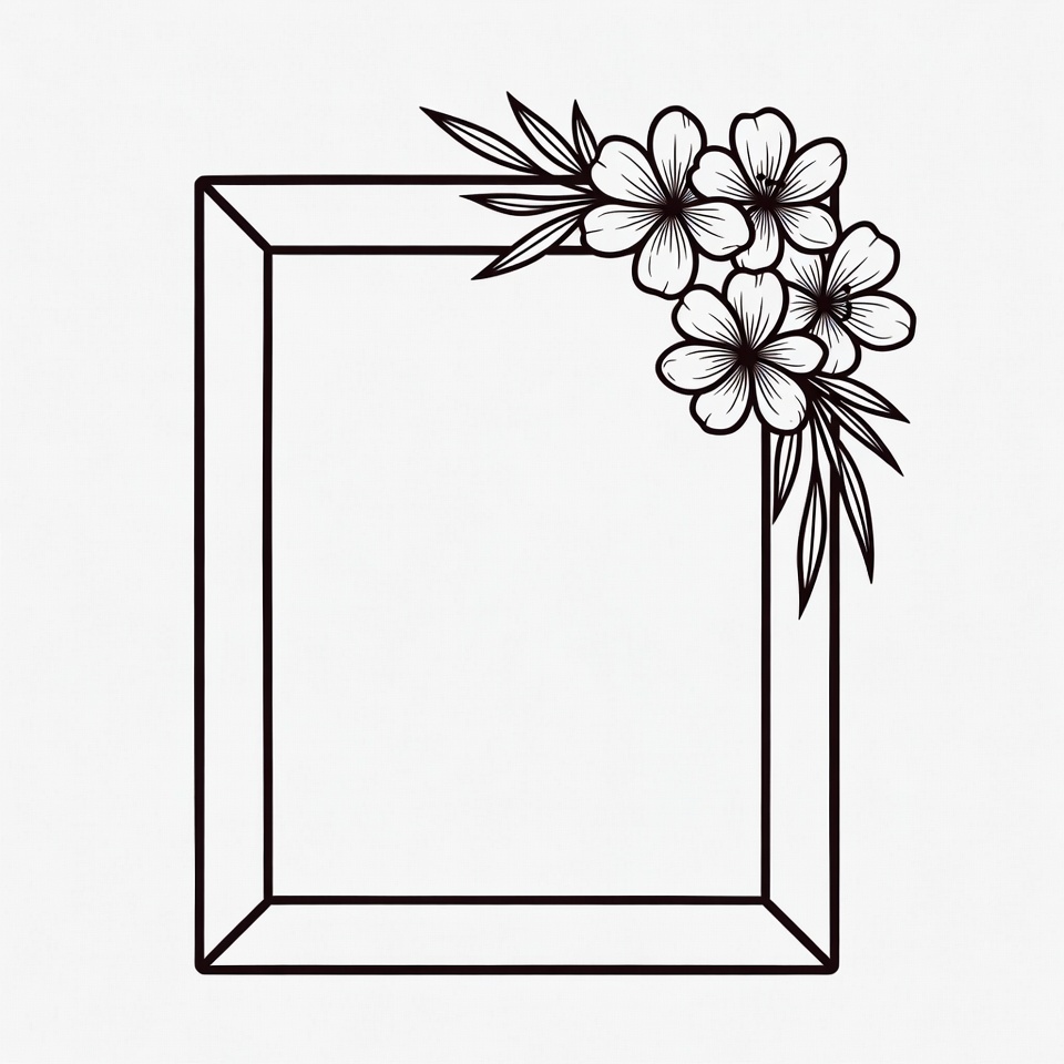 A black line art illustration features a square picture frame with an empty interior. The top-right corner is adorned with a cluster of hibiscus flowers and leaves in a delicate, hand-drawn style. The design is simple and isolated on a white background.