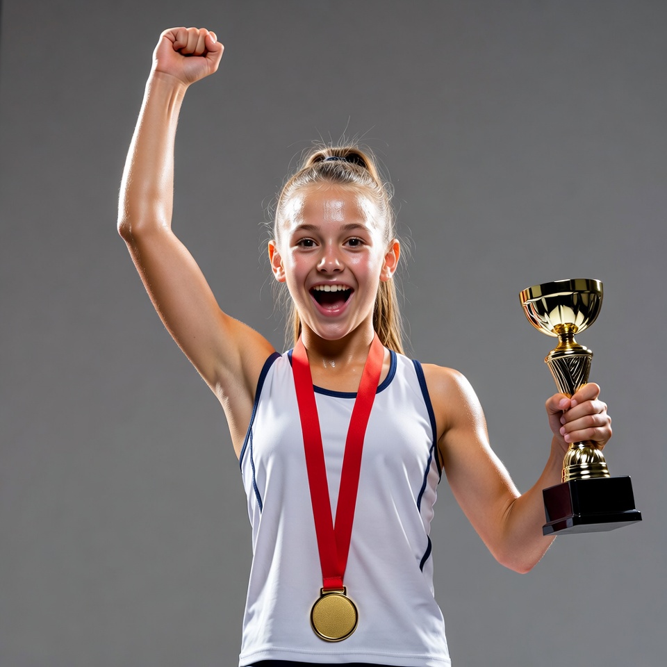 A young girl with ponytail smiles excitedly while raising one arm in victory. She wears a white tank top with blue accents and a red medal around her neck. In her other hand, she holds a gold trophy with black base against a gray background.