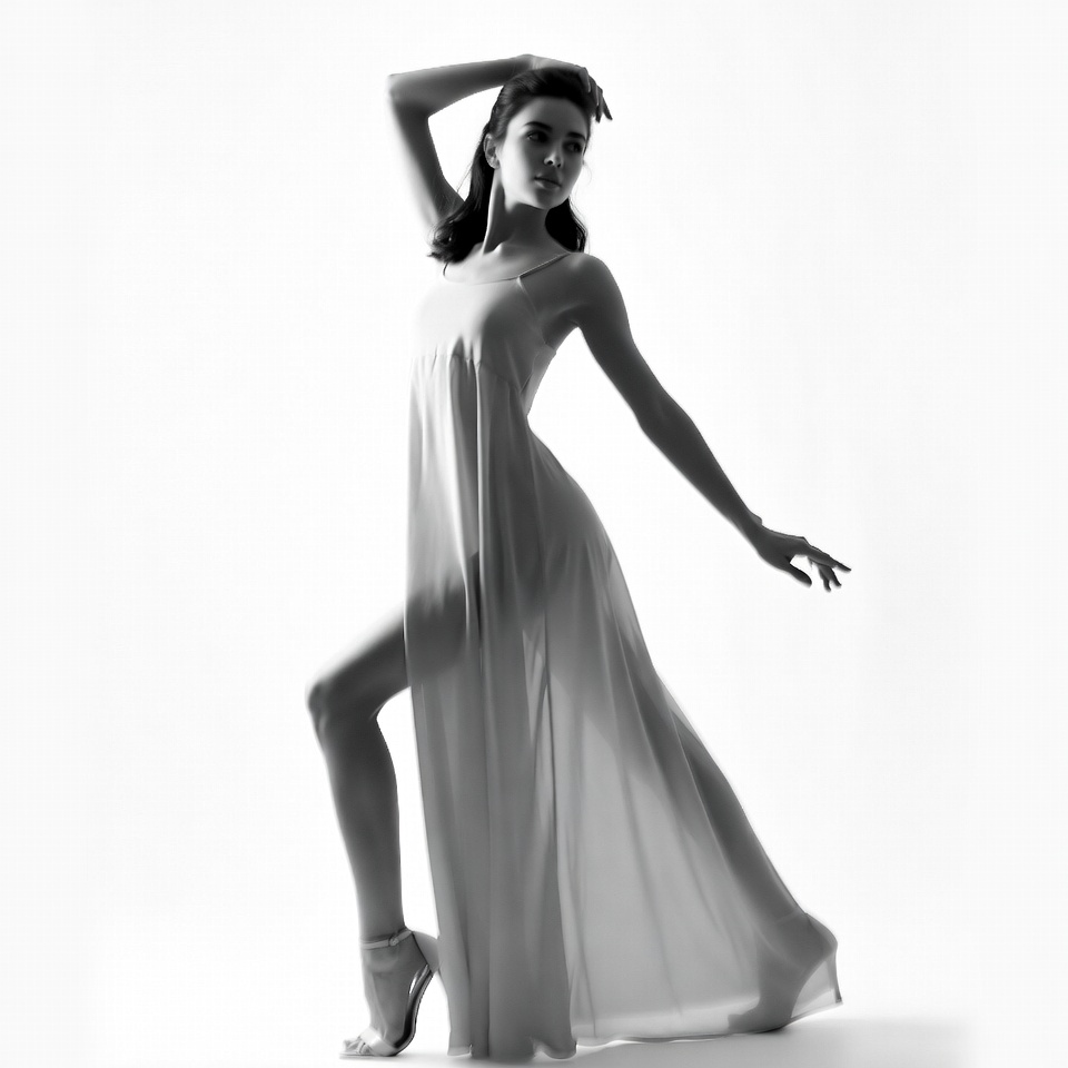 Asian, arm raised, black and white, dance pose, dancer silhouette, elegant pose, fashion pose, female, flowing dress, graceful woman, high heel, isolated background, leg extended, long hair, posing, sheer dress, silhouette, spaghetti strap, studio photo, wavy hair, white background, woman