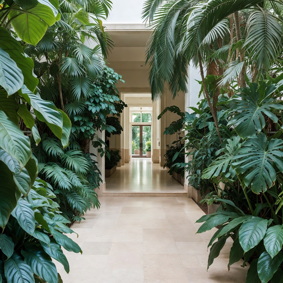 Lush Tropical Plants Framing Indoor Walkway