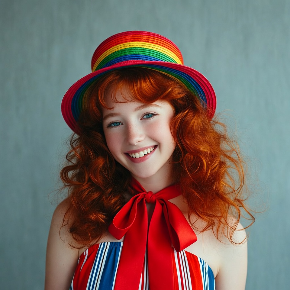 White, blue eyes, bow tie, colorful hat, curly hair, fashion, female, freckles, headwear, isolated background, portrait, rainbow hat, red bow, red hair, smiling, strapless dress, straw hat, striped dress, summer hat, vibrant colors, young girl, girl