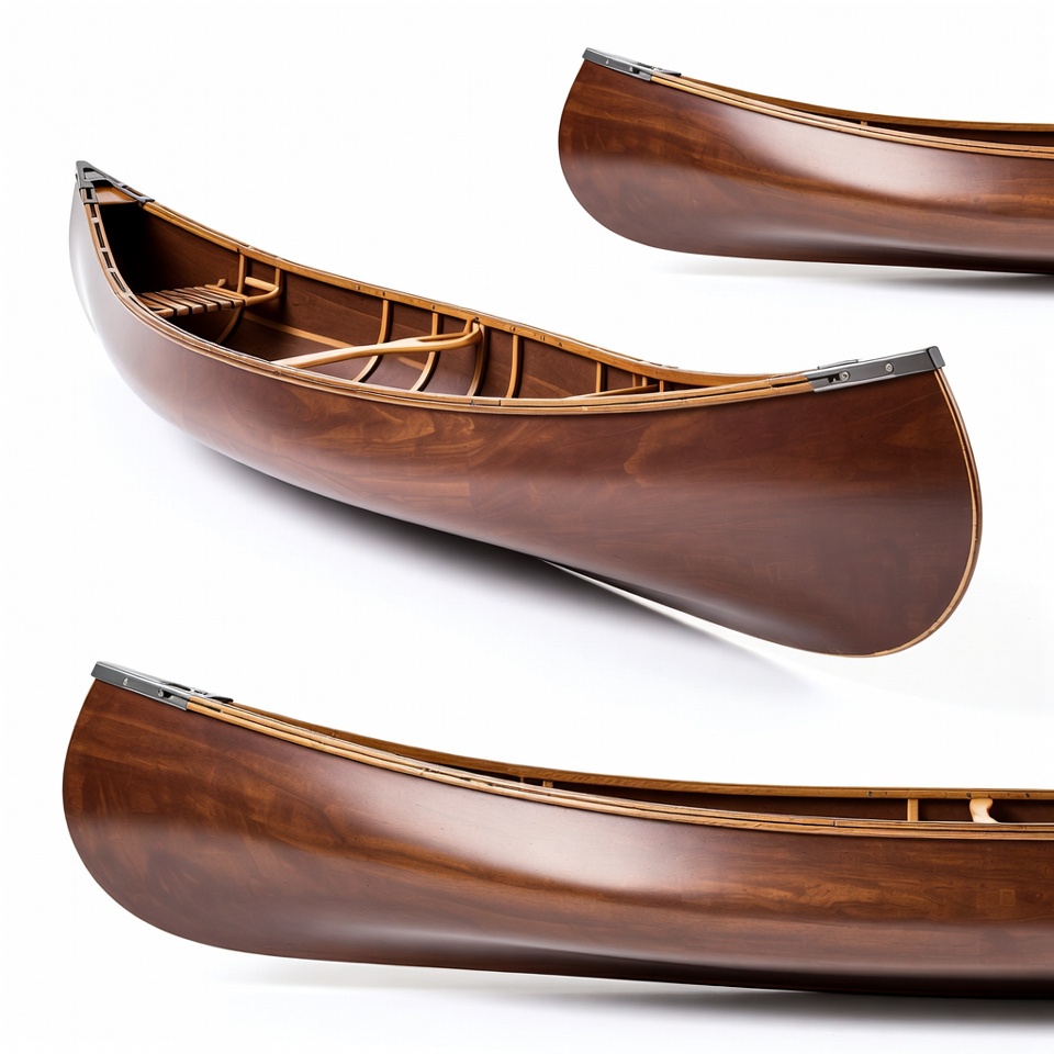 boating, brown canoe, canoe boat, canoe gunwales, canoe thwarts, isolated background, multiple views, outdoor gear, polished wood, side view, top view, traditional canoe, watercraft, white background, wood canoe, wooden canoe, canoe
