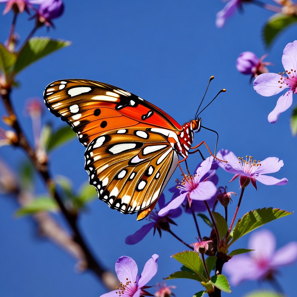 A vibrant orange butterfly with white and black spotted wings perches on delicate purple flowers. The scene features a clear blue sky background with green leaves and additional blooming purple blossoms. The butterfly's intricate wing patterns and antennae are prominently visible.
