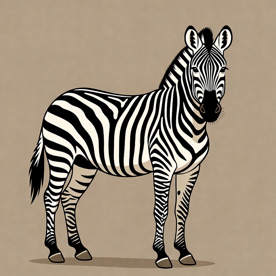A black and white zebra stands in profile on a plain beige background. The illustration features bold stripes across its body, mane, and tail. It has a detailed face with prominent ears and hooves.