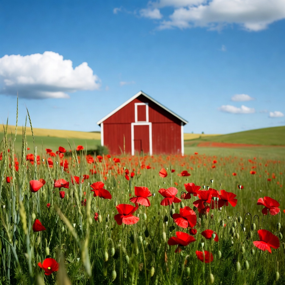 barn, blooming poppies, blue sky, clouds, countryside, farm building, field, flowers, golden fields, grass, green hills, nature, outdoor scenery, poppy field, red poppies, rolling hills, rural landscape, summer landscape, vibrant colors, white clouds, red barn