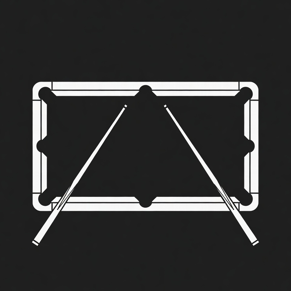 A white silhouette illustration of a rectangular pool table with rounded corners and six pockets. Two cue sticks are crossed in an X shape over the table's surface. The design is set against a solid black background.
