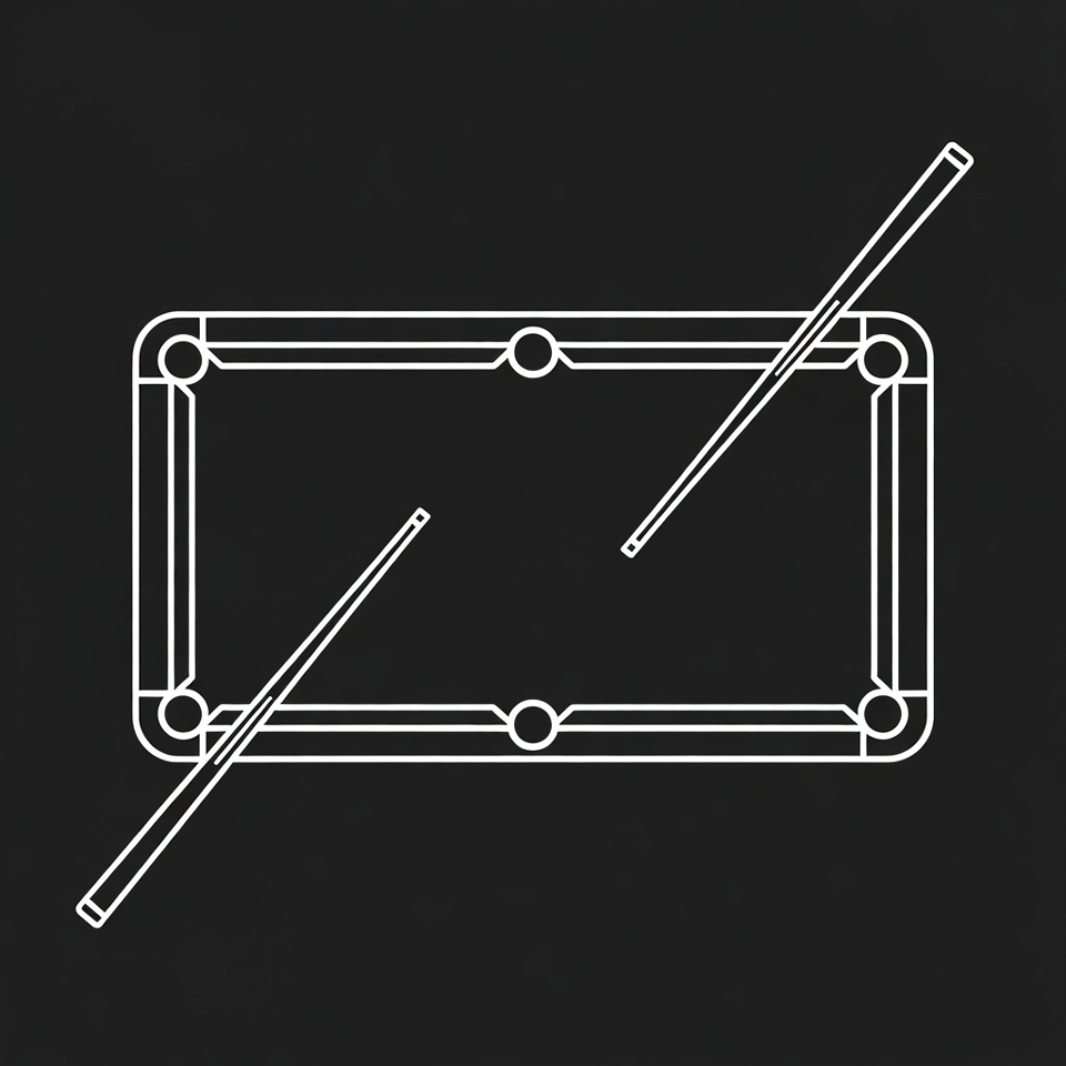 A simple line art illustration of a rectangular pool table with rounded corners and pockets. Two cue sticks are crossed over the table surface. The design features a black background with white outlines.