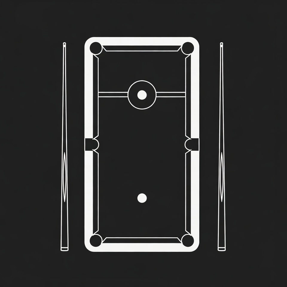 A simple white line art illustration of a pool table on a black background. Two cue sticks stand vertically on either side of the table. A single white dot representing a billiard ball is positioned near the center.