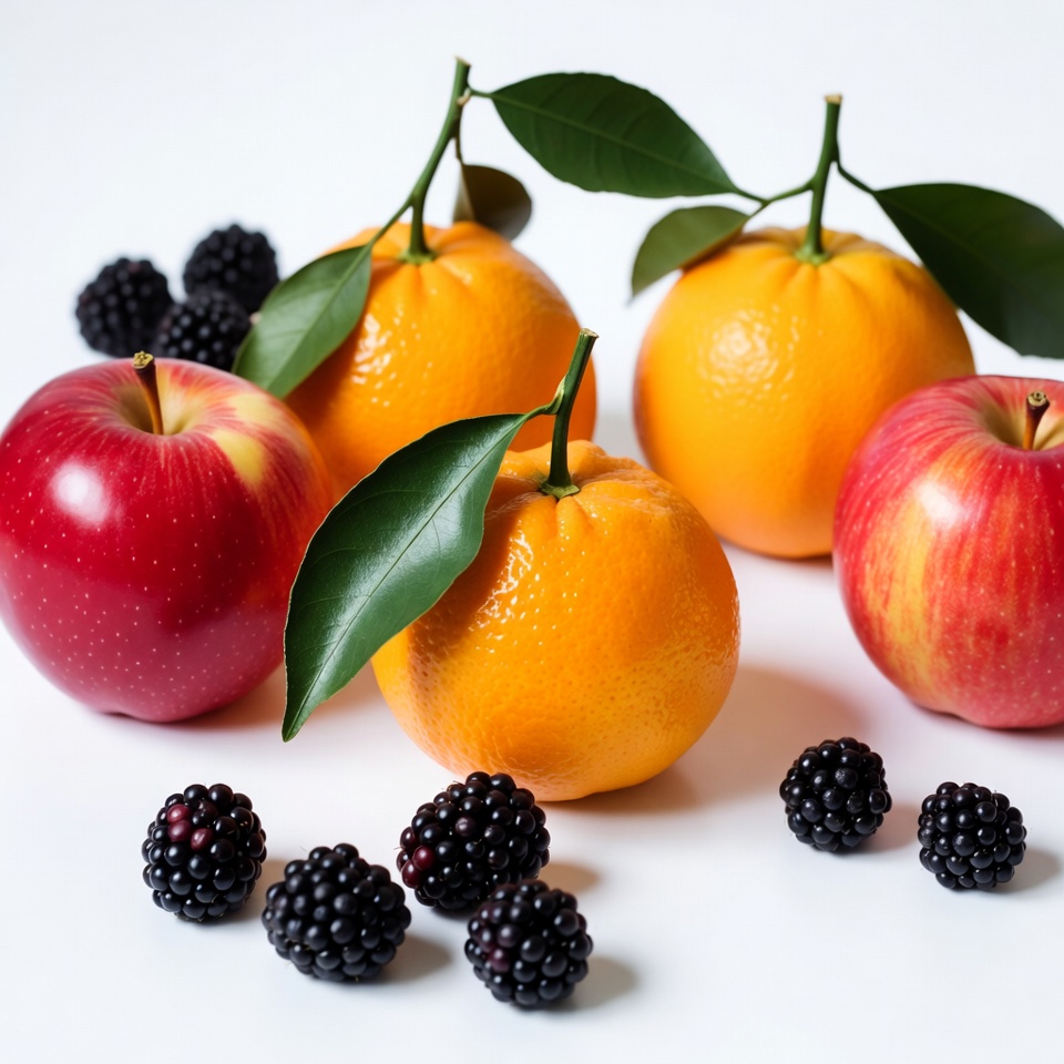 apple leaves, apples, berries, blackberries, citrus fruit, flat lay, food photography, fresh fruit, fresh produce, fruit arrangement, fruit bowl, fruits, green leaves, healthy fruits, isolated fruits, orange leaves, oranges, red fruit, ripe oranges, still life, vibrant fruits, white background, red apples