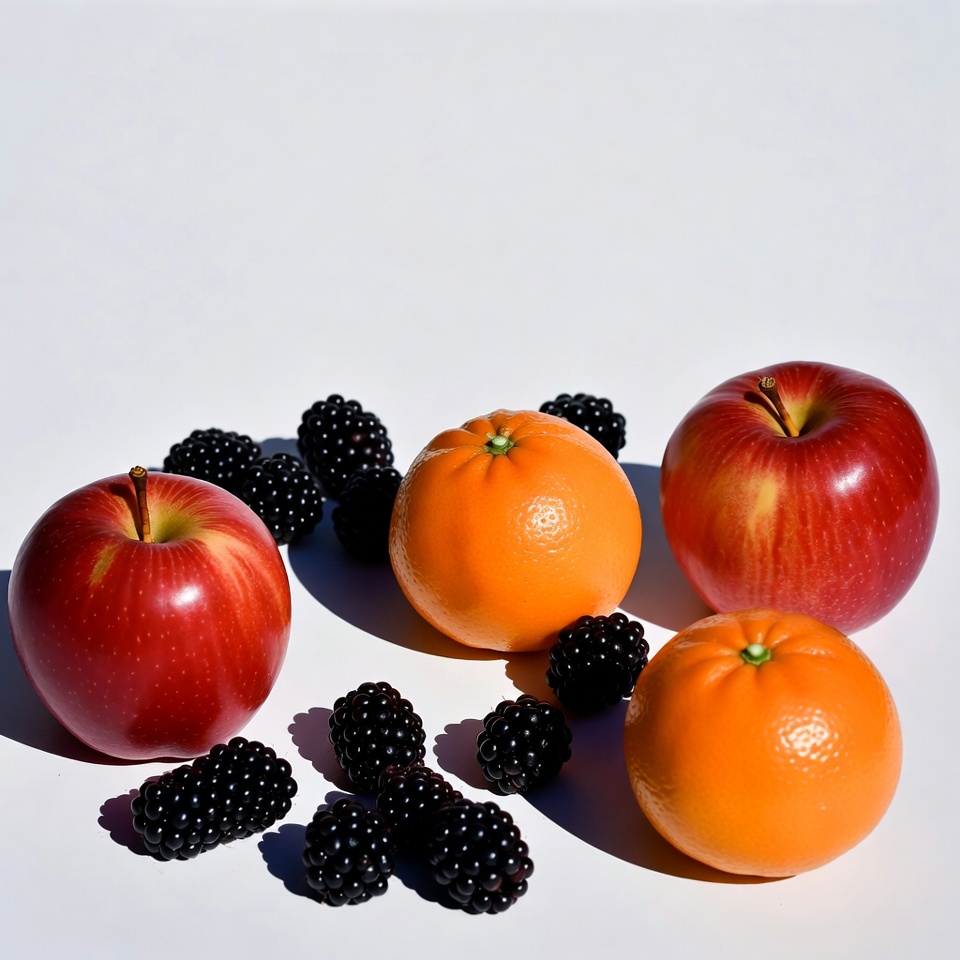 Several shiny red apples, vibrant oranges, and clusters of blackberries are arranged on a plain white background. The fruits cast subtle shadows, highlighting their fresh textures and colors. The composition features multiple pieces of each fruit scattered naturally.