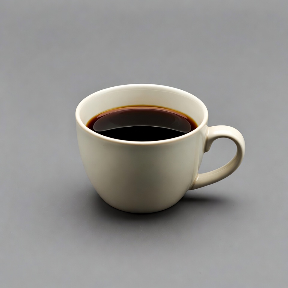 A white ceramic cup filled with steaming black coffee sits on a gray background. The coffee has a glossy surface with subtle highlights. The cup features a simple handle and smooth edges.
