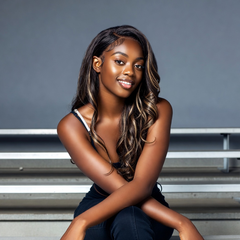A young African-American woman with long wavy dark hair sits on metal bleachers with arms crossed. She wears a sleeveless top and dark pants, smiling warmly at the camera. Her skin glows against the gray background.
